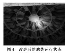 通過分析和試驗,從兩方面進行了改進。首先 優(yōu)化操作程序,C 站除塵自動程序是 93 min 一個 循環(huán)周期, 開機時自動清灰 3min 后進入除塵程 序,但反吹氣流振動不劇烈,短時間清灰量不多。 后規(guī)定開機時手動反吹清灰 15min,將加熱后的粉 塵盡可能多的反吹下來;其次,通過近幾年摸索, 逐步減少濾袋數(shù)量,增大濾袋間隙,降低濾袋間架 橋的幾率, 目前減少濾袋數(shù)量合計 20%。 通過改 進,基本解決濾袋粘接、架橋現(xiàn)象,同時沒有影響除塵效果。效果對比見圖 3、圖 4。