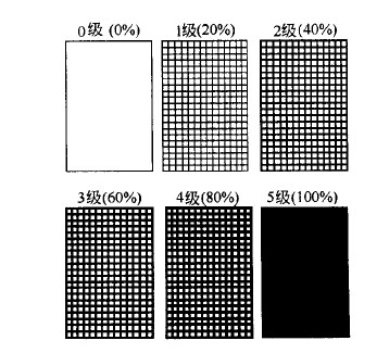 林格曼煙氣濃度圖是 19 世紀(jì)末法國(guó)的林格曼提出的。這種方法是把圖放置在適當(dāng)?shù)奈恢蒙?,使圖上的黑度與煙氣的黑度(或不透光度)相比較,憑視覺進(jìn)行評(píng)價(jià)。在工業(yè)爐窯大氣污染物排放標(biāo)準(zhǔn)中,排放限制(除非金屬焙燒爐窯外)為煙氣黑度不大于 1 級(jí)。林格曼圖有多種規(guī)格,通用標(biāo)準(zhǔn)形式是由 14c m ×21cm 的黑度不同的 6 小塊組成。除全白與全黑塊 2 外,其他 4 塊是在白色背底上畫上不同寬度的黑色條格。根據(jù)黑色條格在整修小塊中所占的面積的百分?jǐn)?shù)分成 0-5 的林格曼級(jí)數(shù): 0 級(jí)是全白, 5 級(jí)是全黑, 1 級(jí)是黑色條格占整塊面積的 20% , 2 級(jí)占 40% ,以此類推,如圖