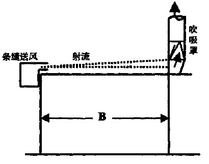 吹吸罩是利用射流作為動(dòng)力,把有害物輸送到排風(fēng)罩口再由其排除,它是依靠吹吸氣流的聯(lián)合工作進(jìn)行有害的控制和輸送。在中包的一側(cè)設(shè)置吹風(fēng)口,在另一側(cè)設(shè)置吸風(fēng)口,吹風(fēng)口布置在操作人員一側(cè),如圖1所示。