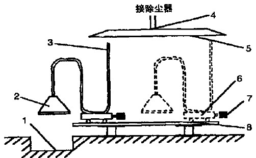 (2)兩級(jí)移動(dòng)式上吸罩結(jié)構(gòu)并不太復(fù)雜,只是需要裝設(shè)一個(gè)可在軌道上推行的小車(chē)。捕塵效果比前兩種好,其缺點(diǎn)是在移動(dòng)管與上部長(zhǎng)形吸塵罩之間會(huì)有少量的漏風(fēng)。如果空間位置狹小,投資費(fèi)用有限。對(duì)環(huán)保有所要求的場(chǎng)所,可以采用這種吸塵罩。
