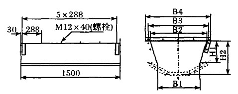 特制的雙層護(hù)煤槽封閉碎煤機(jī)落煤管出口的正壓粉塵氣流,用風(fēng)機(jī)抽氣,使護(hù)煤槽內(nèi)產(chǎn)生負(fù)壓,防止粉塵逸出。同時(shí)輔以多級(jí)旋流濕式除塵器進(jìn)行除塵。雙層導(dǎo)料槽結(jié)構(gòu)及外形尺寸(按35。槽角)如圖2a