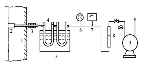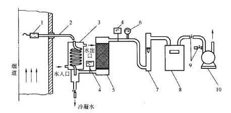 1、煙道;2、過濾器;3、加熱器;4、吸濕管;5、冷卻槽;6、真空壓力力表;7、溫度計;8、圈子流量計;9、抽氣泵