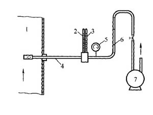 1、煙道;2、干球溫度計;3、濕球溫度計;4、保溫采樣管;5、真空壓力表;6、轉子流量計;7、抽氣泵