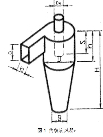 旋風(fēng)器中用的_多的是切向進(jìn)口形成的旋風(fēng)器 ( 如圖 1) ,這種旋風(fēng)器通常可以用以筒體直徑 D 為比值的結(jié)構(gòu)參數(shù) ( 無(wú)因次結(jié)構(gòu)參數(shù) ) 來(lái)設(shè)計(jì)。由于 Stairmand 型 ( _型 ) 研究數(shù)據(jù)比較完整和應(yīng)用中的有效性,許多研究者把自己改進(jìn)旋風(fēng)器與其作性能對(duì)比[ 1 ] 。
