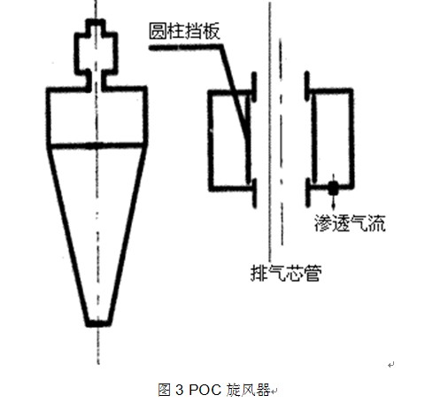 由于旋風(fēng)器對(duì)微細(xì)顆粒物效率較低,尤其對(duì) PM10( 粉塵粒徑小于 10μm 的顆粒物 ) 的除塵效率隨著顆粒直徑減小逐漸降低。也_是說(shuō),在旋風(fēng)器的運(yùn)行過(guò)程中,絕大部分微細(xì)粉塵穿透了分離區(qū)域,導(dǎo)致對(duì)微細(xì)粉塵效率下降。 A.Plomp 等 [3] ( 1996 年)提出了加裝二次分離附件的一種旋風(fēng)器,見(jiàn)圖 3 示意圖。二次分離附件設(shè)置在旋風(fēng)器本體頂部,稱(chēng)之為 POC(post cyclone) 。