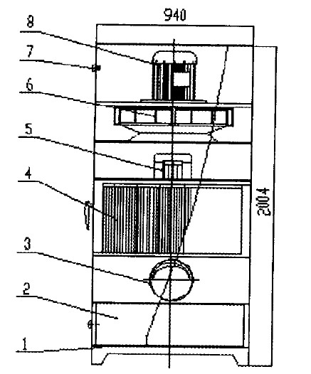 1.箱體;2.盛粉塵抽屜;3.粉塵吸入口;4.粉塵過濾布袋;5.振蕩機(jī)構(gòu);6.風(fēng)機(jī);7.電控系統(tǒng);8.主電機(jī)